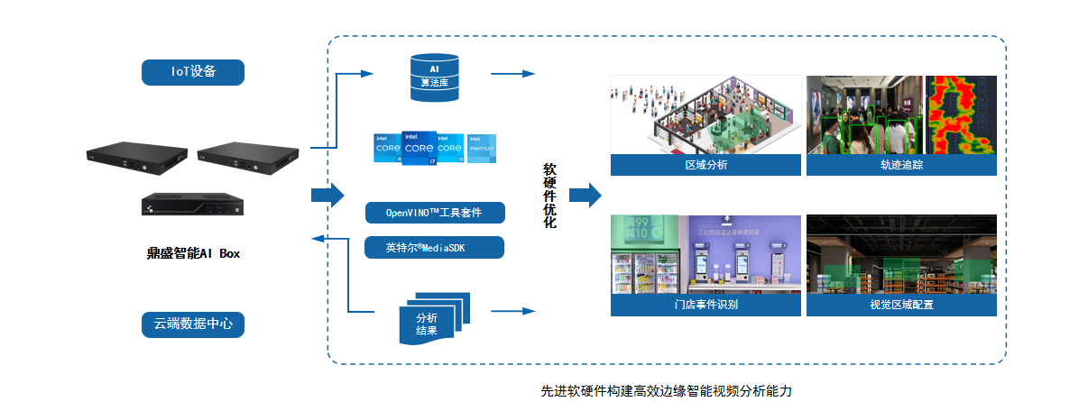 人工智能正從技術概念走向千行百業,實現多場景的實際落地?;谶吘?AI 的智能視頻分析解決方案目前已在智慧城市、智慧社區、智能交通、智能制造、智慧零售等10 余個領域獲得廣泛運用。作為國內領先的物聯網設備及解決方案提供商,鼎盛智能順應這一趨勢。與英特爾攜手,以英特爾?AI?計算盒參考設計?(簡稱“AI Box”)?作為核心,構建“云邊端”架構數字化解決方案,助力多行業智能化轉型升級。