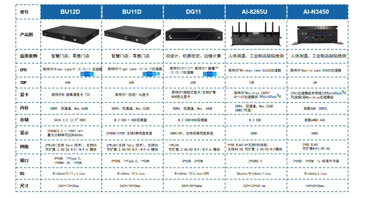 鼎盛智能已推出多款性能優異,算力強勁的AI BOX。其中新上市的BU12D基于英特爾12代Alder Lake-P i3/i5/i7系列處理器,采用雙通道DDR5內存設計;整機提供3x HDMI2.0 + 1x DP1.4四個數字顯示輸出,支持4路同顯或異顯,支持8K輸出;支持1路4K@60Hz/30Hz HDMI視頻輸入;擴展性能方面,提供9個USB接口(其中1個為Type-C),支持SATA存儲,1*COM,5*M.2(用于擴展WIFI/BT/4G/5G,SATA及PCIe X4信號),適用于新零售、智慧園區、工業制造、智慧交通等應用行業。