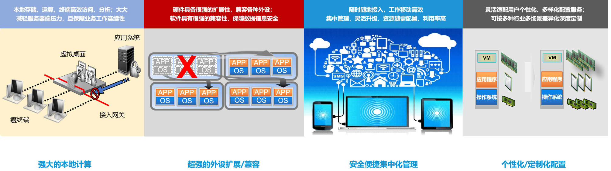 為解決這一問題,越來越多企業、部門機構開始部署虛擬云桌面。傳統云桌面(VDI)主要依托云端服務器的算力,云端集中統一管理,該方案有效節省了設備采購及運維管理支出。但是VDI方案也存在一些缺點,其一是對云端算力的依賴,本地終端算力較弱無法滿足一些處理能力要求較高的應用支持;其二,對網絡的依賴,將直接影響終端應用的工作運行效率;其三,外設兼容性差,無法滿足多應用場景下的外設兼容性問題。