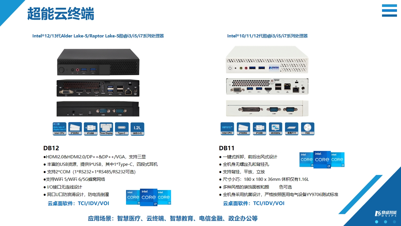 鼎盛智能5G醫(yī)療超能云終端支持英特爾10/11/12/13代平臺(tái)系列處理器,具備高性能、高算力、高穩(wěn)定特性,可在保證醫(yī)院業(yè)務(wù)連續(xù)性、全面適配所有終端設(shè)備、超強(qiáng)醫(yī)療外設(shè)兼容、為醫(yī)生提供良好使用體驗(yàn)等方面獨(dú)具優(yōu)勢(shì),覆蓋門診收費(fèi)、醫(yī)護(hù)工作站、手術(shù)室、檢驗(yàn)科、核磁共振室、B超室等各類應(yīng)用場(chǎng)景。同時(shí)該方案提供集中化運(yùn)維管理,可實(shí)現(xiàn)醫(yī)院各場(chǎng)景科室的集中統(tǒng)一部署、應(yīng)用軟件升級(jí)、系統(tǒng)升級(jí)補(bǔ)丁,也可以遠(yuǎn)程快速恢復(fù)終端故障,避免了傳統(tǒng)IT管理方式下分散部署和維護(hù)的問題,降低了IT管理的復(fù)雜度及難度。同時(shí)該方案對(duì)醫(yī)院現(xiàn)有各種讀卡設(shè)備(身份證、社保卡、診療卡)、打印機(jī)、網(wǎng)絡(luò)打印機(jī)、掃描儀等外設(shè)的全面兼容,實(shí)現(xiàn)了終端集中管理,大幅度降低全院的IT運(yùn)維綜合成本,能夠真正解決醫(yī)院大規(guī)模復(fù)雜終端的管理、運(yùn)維、安全等難題,進(jìn)一步推進(jìn)醫(yī)院醫(yī)療信息化的發(fā)展落地。