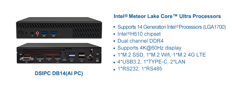 鼎盛智能DB14基于英特爾Meteor Lake最新平臺處理器,搭載英特爾酷睿™Ultra處理器,圖形處理性能較之上一代提升1.81倍,AI性能較之上一代提升1.5倍,具備更優異、更快地分析數據及處理更多視頻流的能力。DB14支持HDMI2.0、HDMI2.0/DP++、DP++/VGA三個數字顯示輸出接口,支持4K@Hz高清視頻解碼輸出;整機提供豐富的IO擴展接口,USB2.0、USB3.0、Type-C、COM等,滿足不同應用場景下的擴展需求,支持WIFI 6及5G網絡,數據傳輸速度更快。