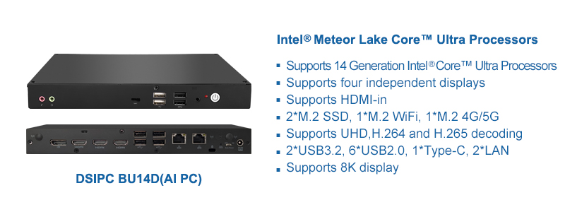 基于英特爾酷睿™Ultra處理器出色的GPU和CPU性能,BU14D具備超強視頻編解碼能力,可提供沉浸式視頻流體驗和卓越的顯示、音頻效果。讓客戶在獲得更強大的計算能力、更優性能的同時,實現出色的功耗優化。BU14D提供4個高清數字輸出接口,支持1x4、4x1、2x2等多種拼接模式,提供8個USB,1個Type-C,1個COM等多種擴展接口,支持外擴多種外部設備,滿足多場景下的應用需求。例如在餐飲行業,餐廳電子標牌不僅能向您展示菜單,還能根據您的預算和飲食需求提供點餐指導;在工業制造車間,能替代人工從源頭把控產品質量和安全問題;在安防監控應用上,能夠更細致且精準進行實時安全監控并及時預警。