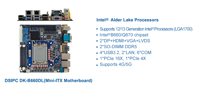 鼎盛智能DK-B660DL支持12/13代英特爾Alder Lake平臺系列處理器(LGA1700),雙通道DDR5內存,提供更快的數字傳輸性能;提供2*DP、HDMI、VGA、LVDS多種數字顯示接口,支持4K分辨率,同時主板提供1*PCIe 16X、1*PCIe 4X擴展插槽,支持擴展獨立顯卡,具備優異的圖像處理性能;主板提供4*USB、6*COM接口,支持客戶多外設、個性化擴展需求。