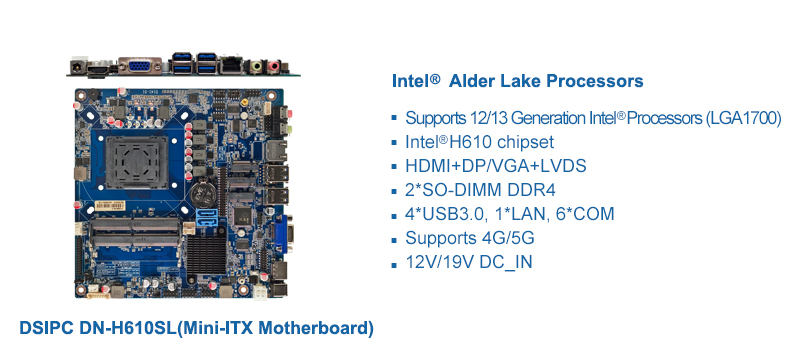 鼎盛智能DN-H610SL采用英特爾600系列芯片組,支持英特爾12/13/14代系列處理器,采用雙通道DDR4內存設計,最大支持64GB;整機提供HDMI、DP/VGA、LVDS顯示輸出,支持3路輸出,最大分辨率可達4096*2160@60Hz,顯示性能優異;擴展性能方面,提供8個USB接口, 6個COM支持,支持M.2及SATA存儲,支持4G/5G移動網絡,適用于AI邊緣計算、智能交互、數字標牌、商務辦公及零售終端等應用。